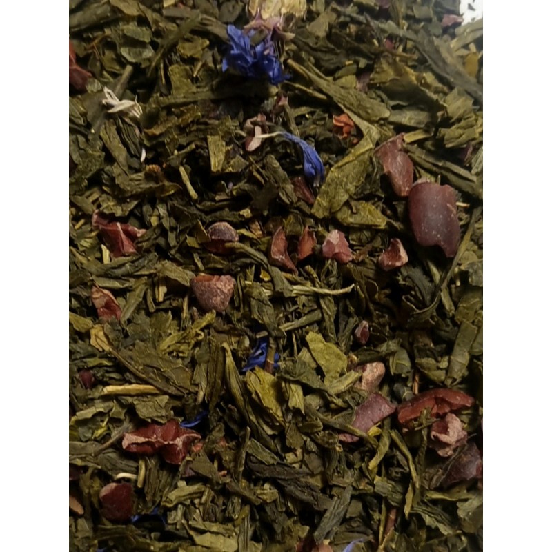 Thé Sencha de Chine avec des fèves de cacao, fleurs de bleuets, copeaux de vanille.